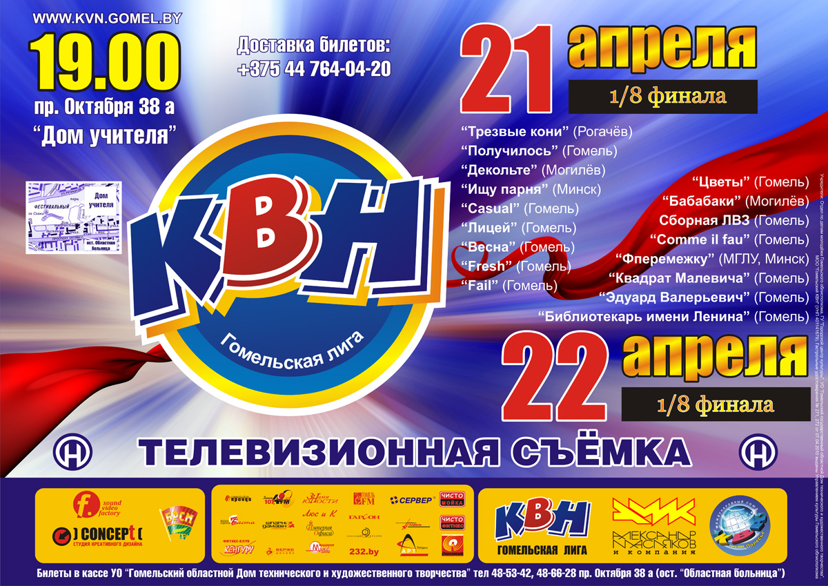 Гомельская лига КВН продолжает сезон! Лучшие команды КВН Гомеля, сойдутся в борьбе за выход в четвертьфинал. Пластичные и статичные, чисто женские и чисто мужские, школьные и работающие, каждый сможет удовлетворить свое чувство юмора. Игры Гомельской лиги КВН - это надо смотреть вживую!